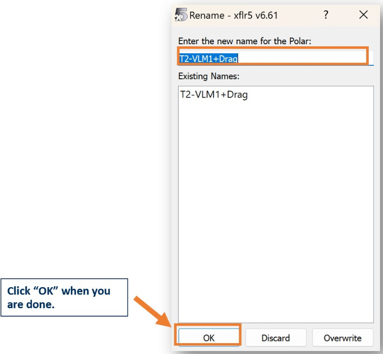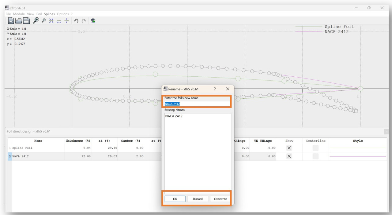 Enter the name of your new airfoil and click OK. Click "Overwrite" if you don't want to add a new airfoil.