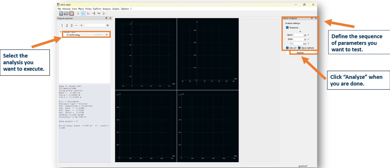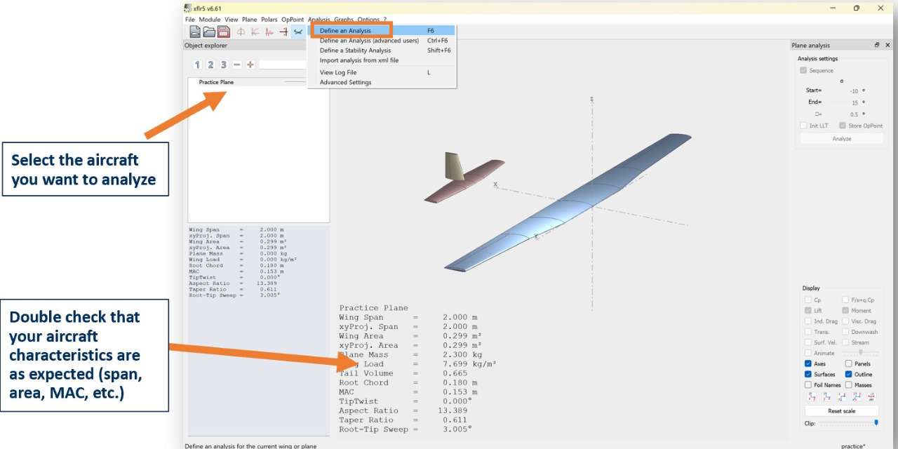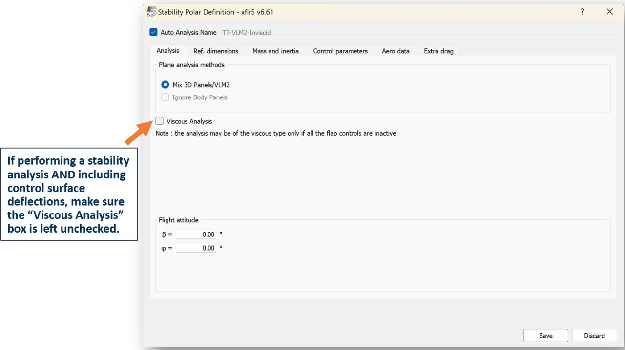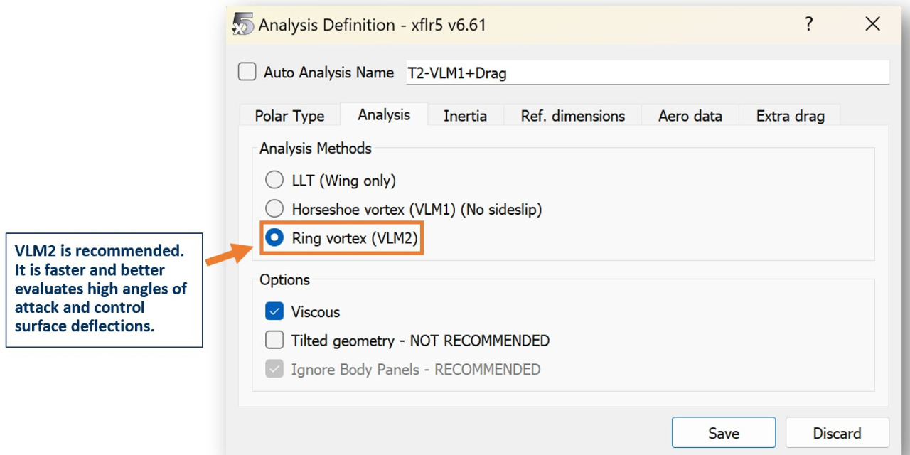 In the Analysis tab, choose your desired analysis method (VLM2 is recommended) and whether or not to include viscous flows.