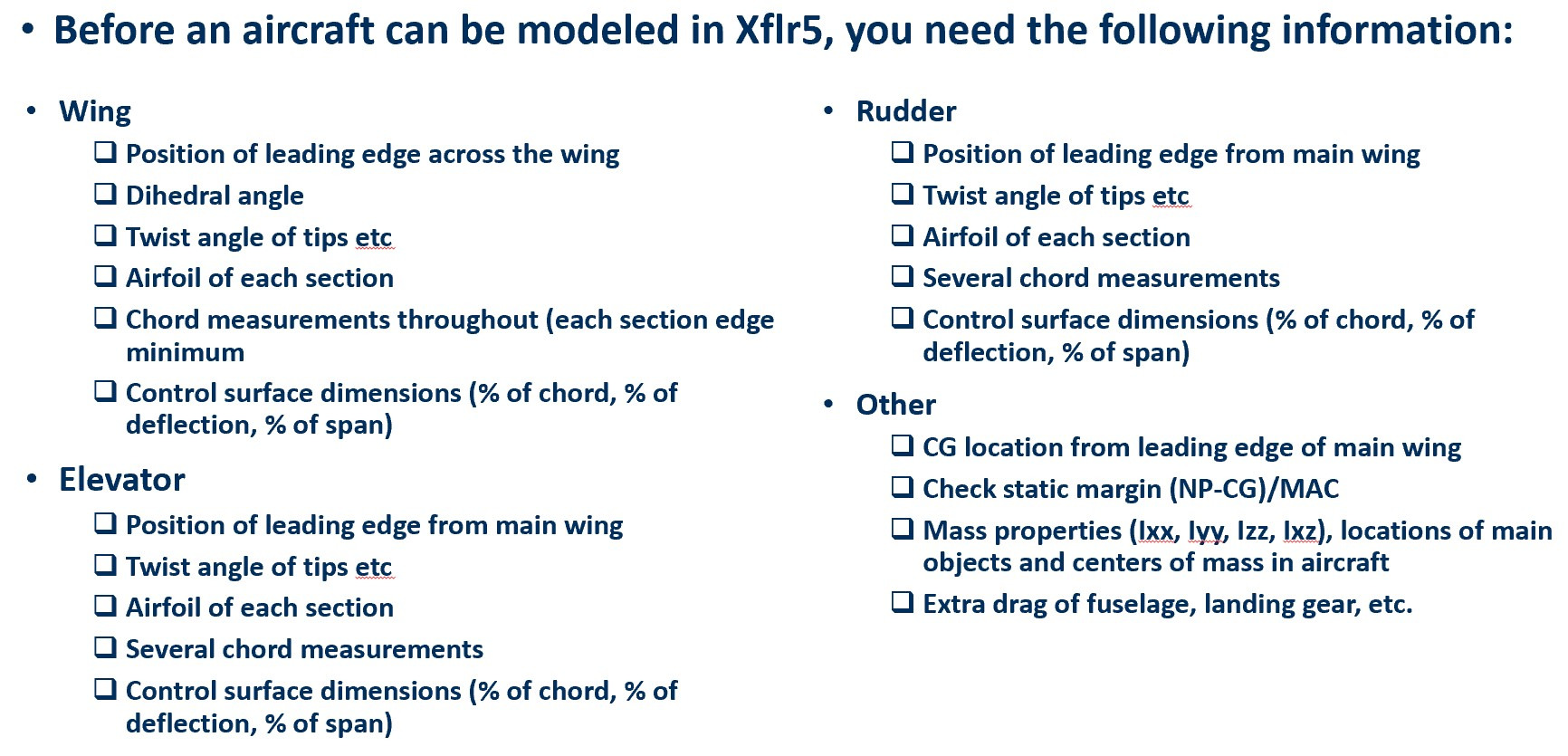 Prerequisite: You must already know the NACA code or have a .dat file on hand for every airfoil on each section of the wing, elevator, and rudder.