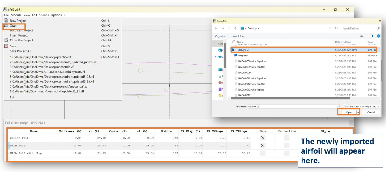 To add a .dat airfoil: > File > Open > Select .dat file from your computer > Open
