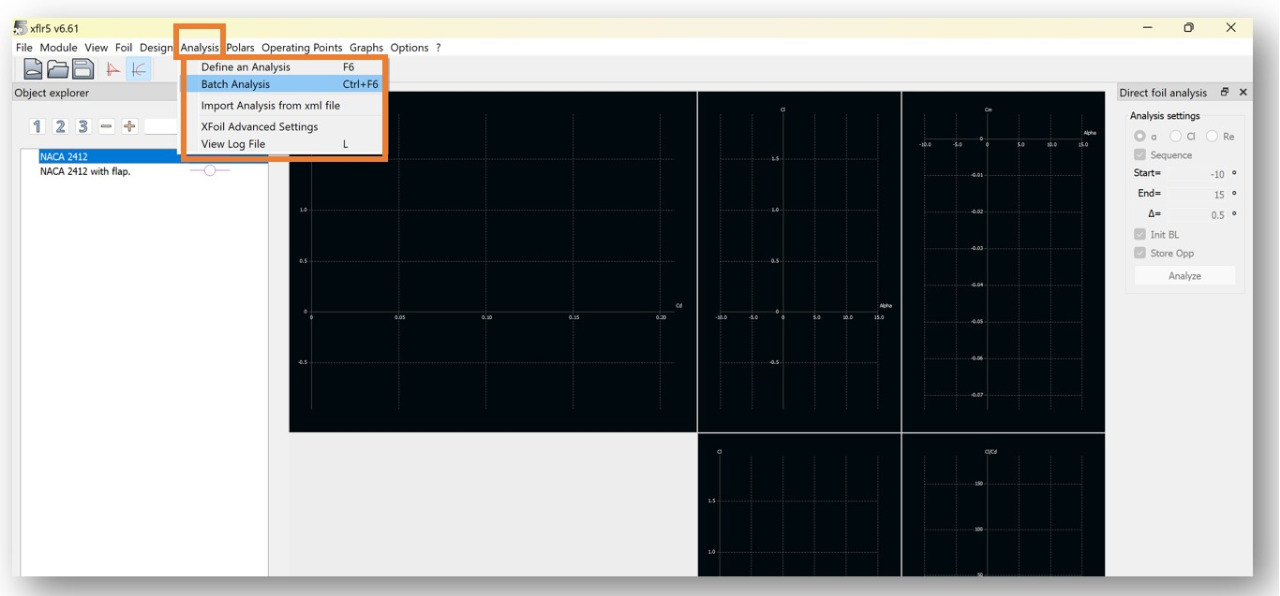 Note: Batch analysis performs many analyses simultaneously across a variety of flight conditions to save time. If you want to analyze the airfoil at a single Reynolds number, choose "Define an Analysis" instead.