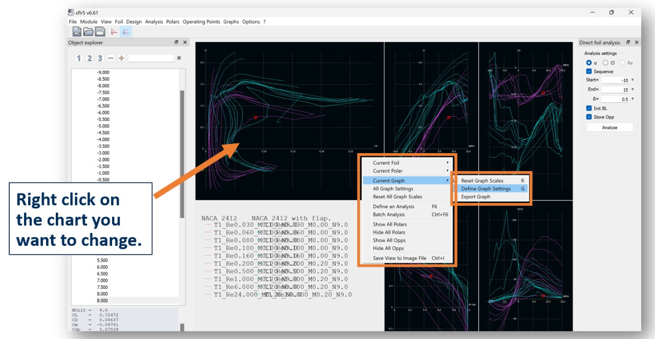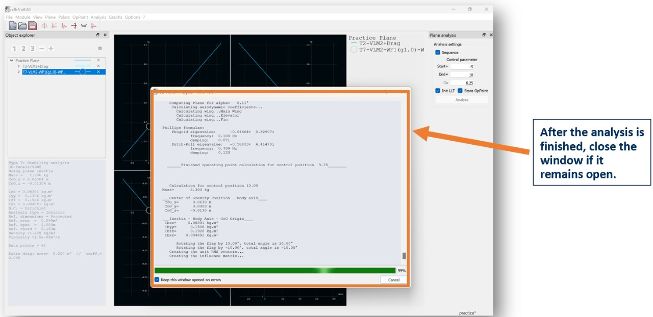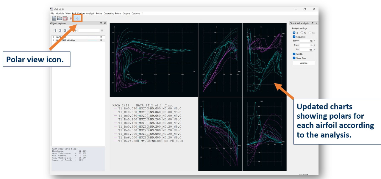 The graphs on the viewer will update after the analysis is completed. In the top menu, the chart icon on the right will show you polar views (drag, lift polars etc.)