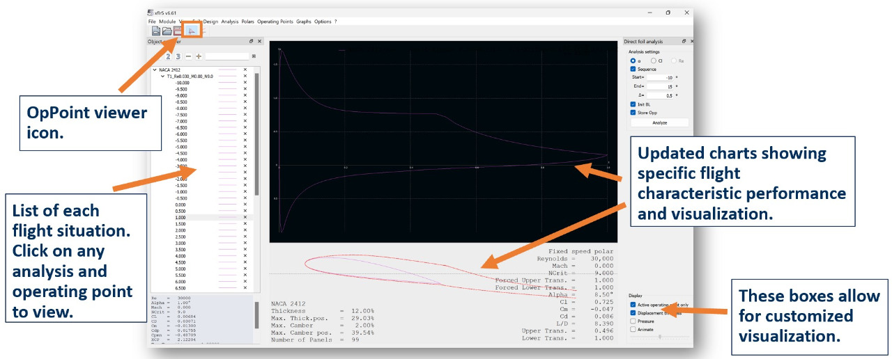 The OpPoint viewer icon is on the left. This viewer will show you performance distributions across the airfoil at specific flight situations (e.g. pressure distributions at a specific angle of attack, flow separation, etc.)