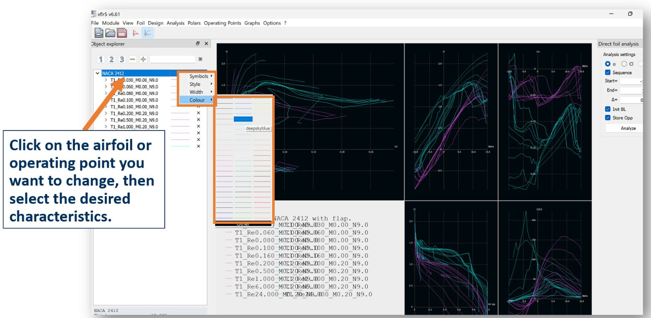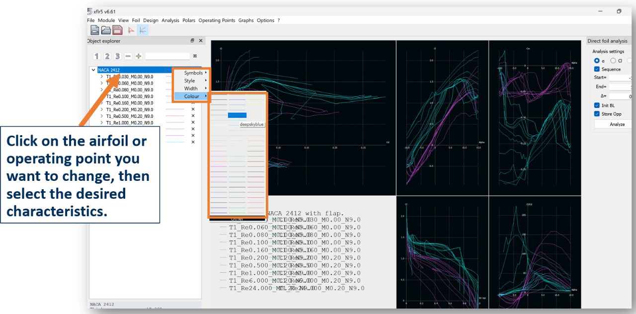 To change the lines on the graphs (color, weight, etc) right click on the airfoil or operating point on the list on the left then select your desired line characteristics.