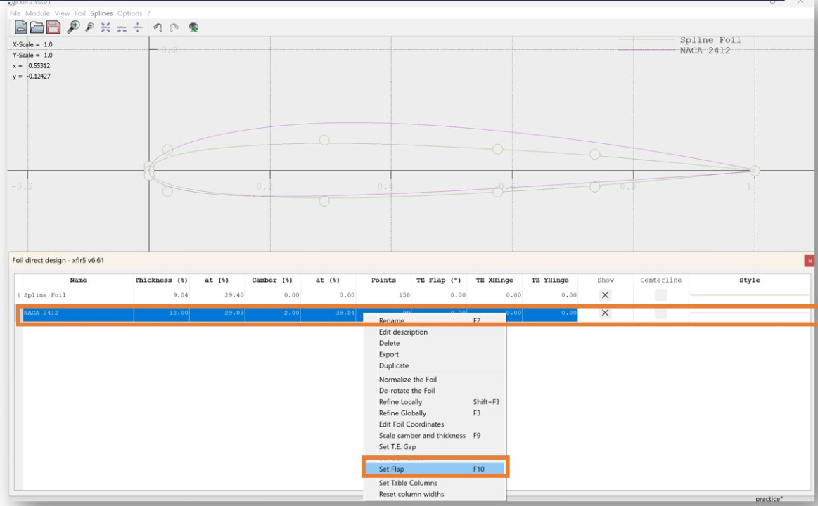 To add a flap to the airfoil: right click on your airfoil, then click "Set Flap"