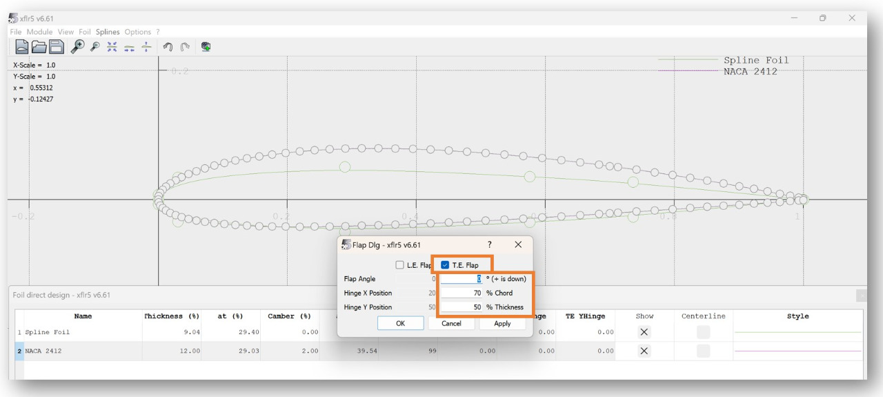 Input the flap characteristics (angle, position along chord, position of hinge)