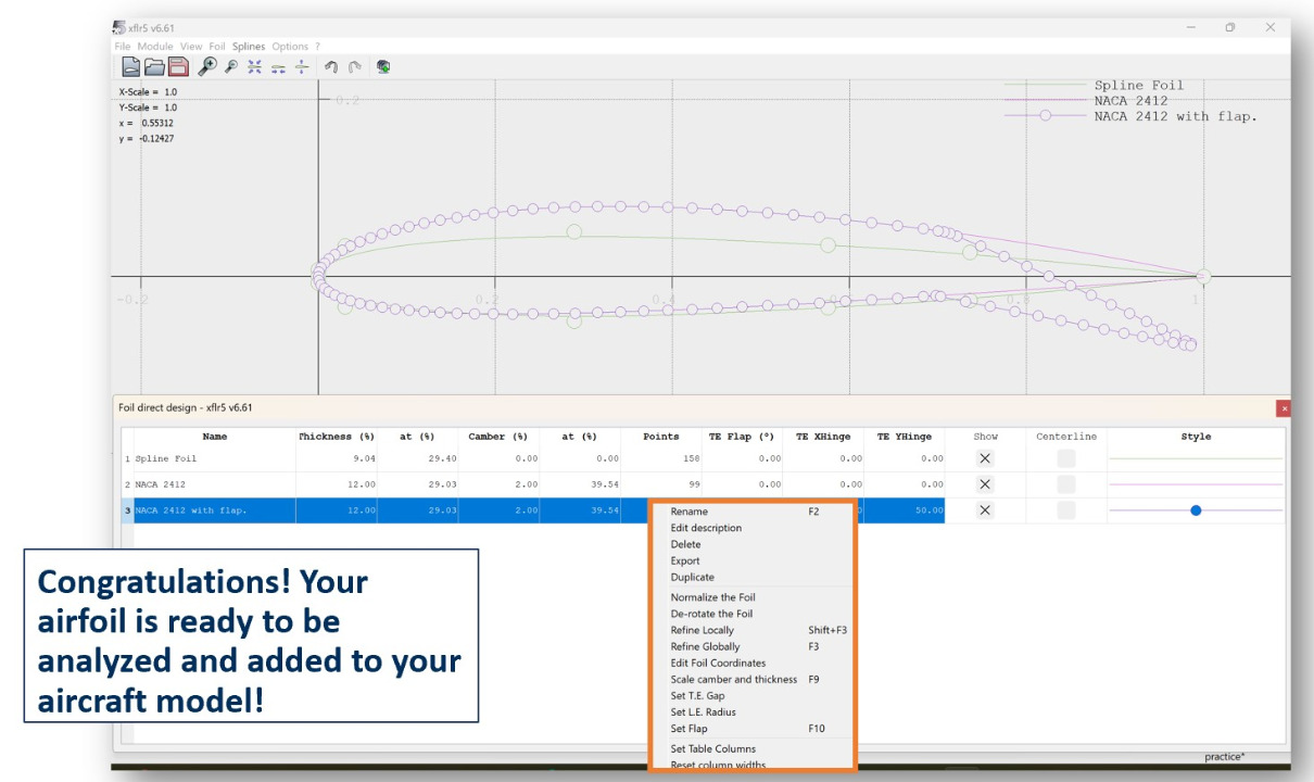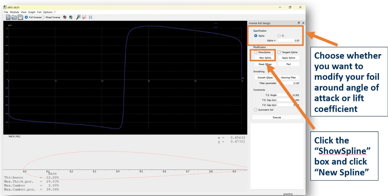 Next, choose what flight condition context you want to modify your airfoil in and activate the spline function.