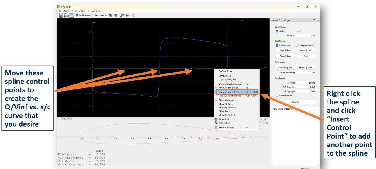 See the graphic below for an overview of the tools in Xfoil Inverse Design