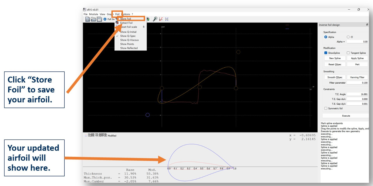 Once the airfoil is created, it can be exported by selecting the "Foil" tab at the top and then the "Store Foil" option.
