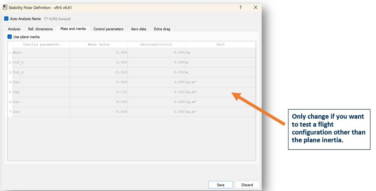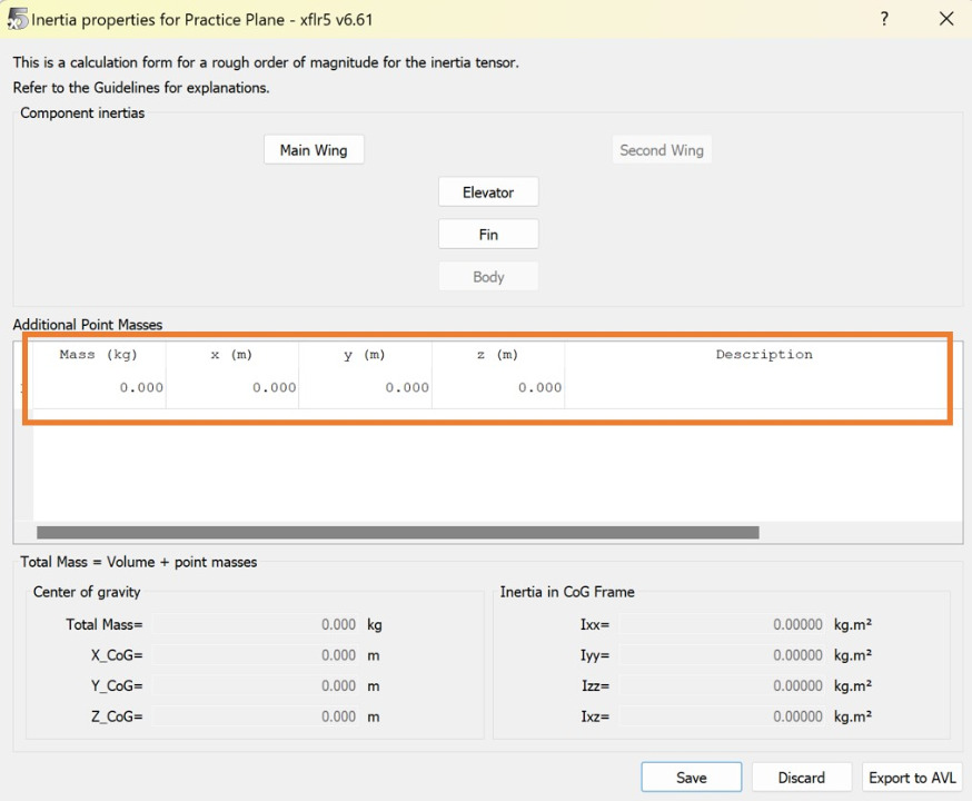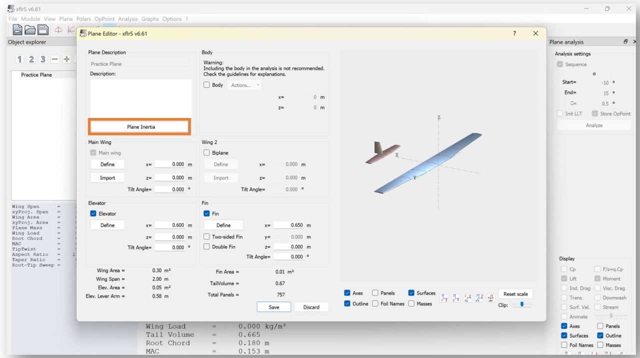 After all your lifting surfaces are correctly defined, click on the "Plane Inertia" button to define the weight distribution of your aircraft.