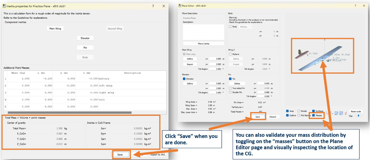 You can also validate your mass distribution by toggling on the "masses" button on the Plane Editor page and visually inspecting the location of the CG.