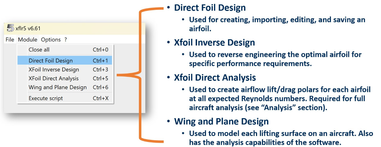 These modules contain the different tools and features of XFLR5.