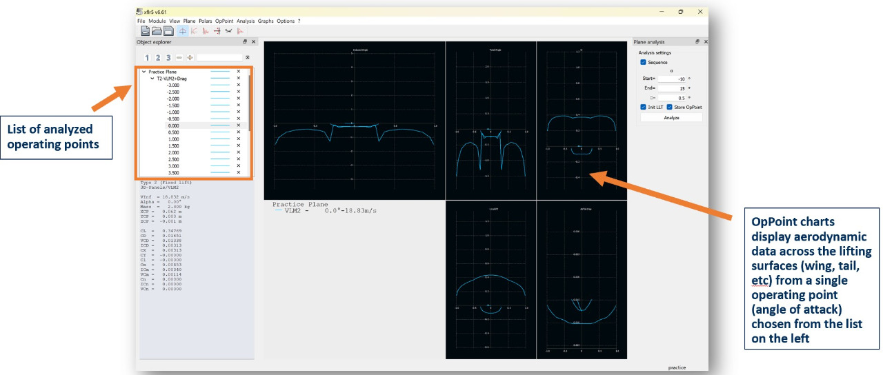 The OpPoint viewer shows several charts that display spanwise aerodynamic data at specific points of the analysis (e.g. at specific angles of attack)