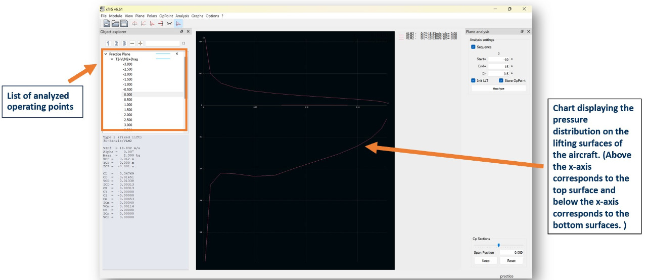 The pressure viewer shows the pressure distributions across the lifting surfaces of the wing at specific operating points of the analysis.