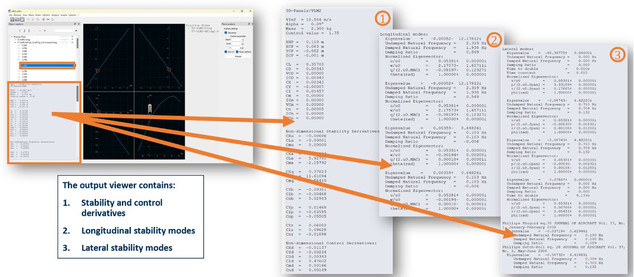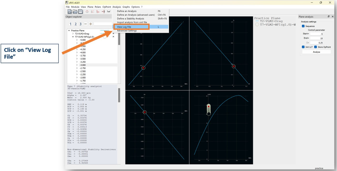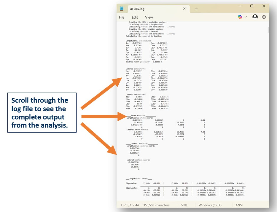 The log file contains the complete outputs at each point of the analysis such as each stability and control derivative, state matrices, and stability response modes.