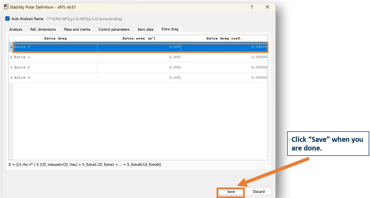 In the Extra drag tab, add any extra drag areas and drag coefficients in the corresponding table. Xflr5 only accurately simulates airflow over the lifting surfaces of the aircraft, so the drag from the fuselage, landing gear, or any other parts of the aircraft need to be accounted for separately.