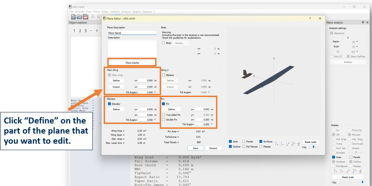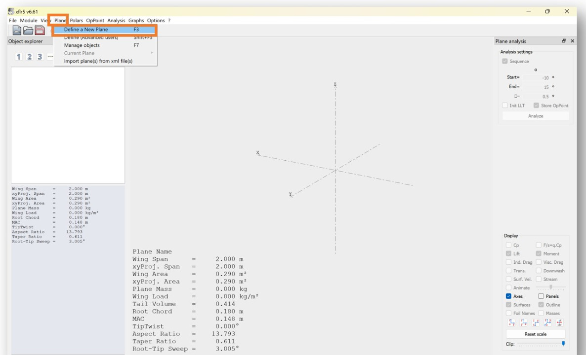 Open the "Wing and Plane Design" tab in the top left menu. To begin modeling your aircraft, click on "Plane" on the top left menu. Then select "Define a New Plane".