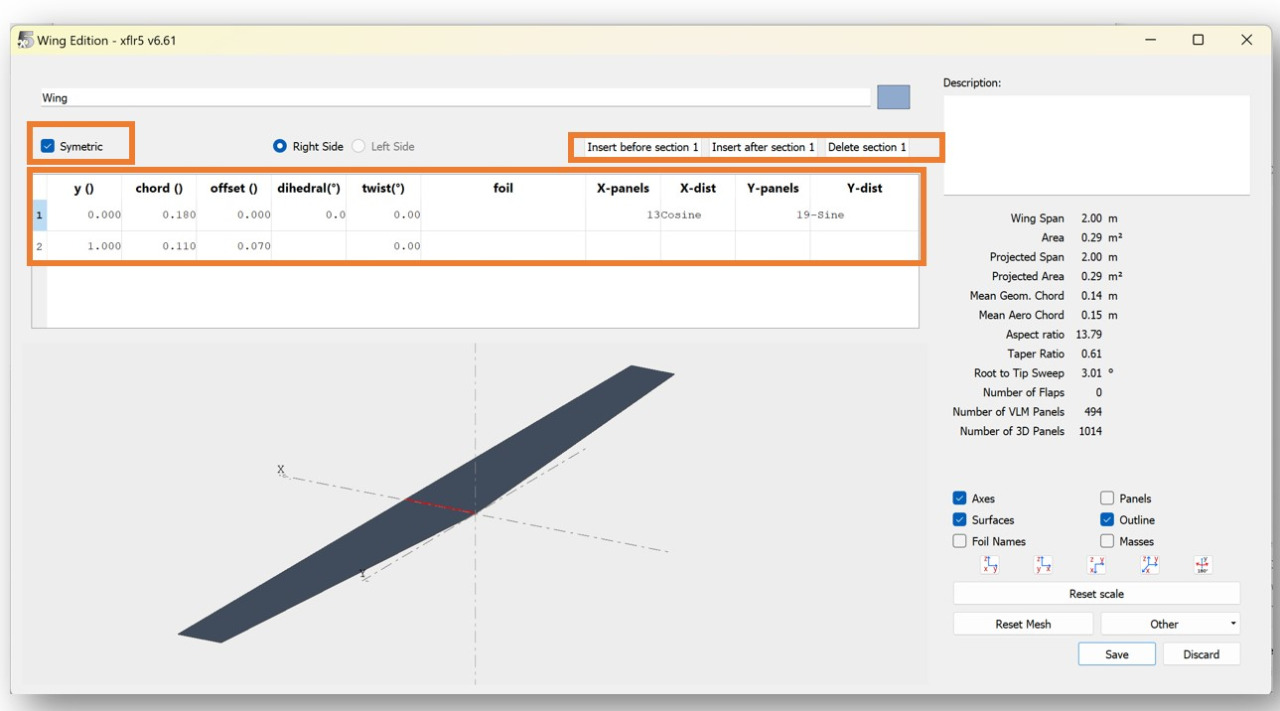 To create a wing, first click the "Symmetric" button (depending on your wing design). Next, begin inputting your wing data into the table below. Input the airfoil and airfoil position for each section of the wing into the table. Make sure your measurements are in meters. (Reminder: your airfoils must already be created in Foil Design and analyzed in Xfoil Direct Analysis).