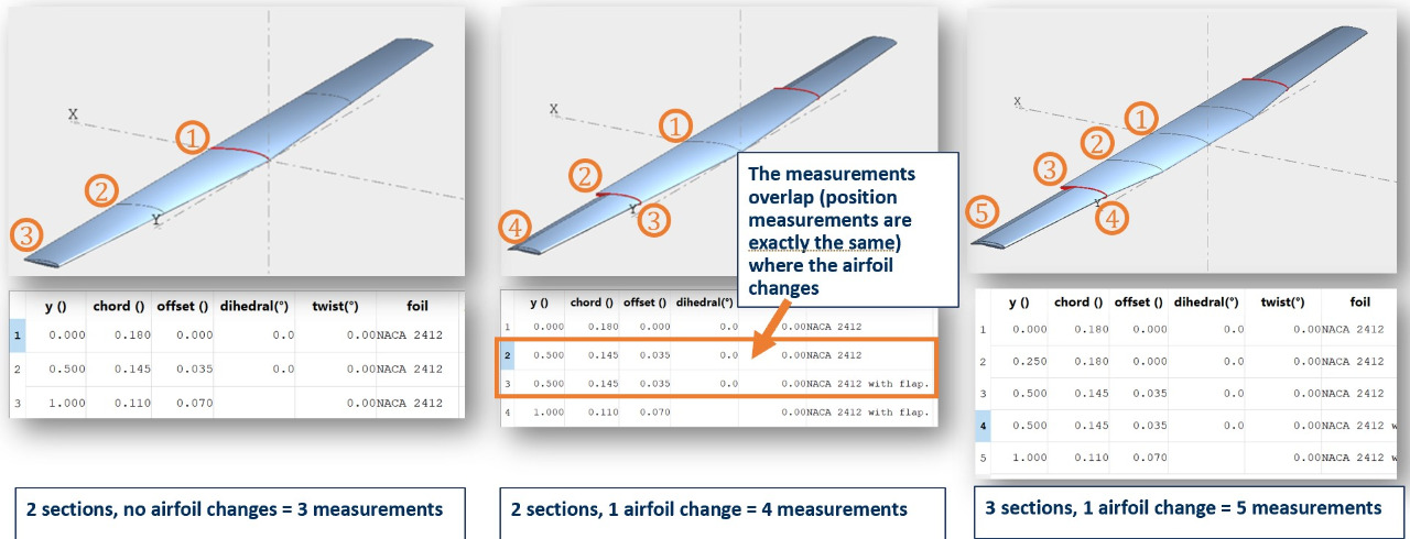 Note: You should have a measurement for every major change in the wing. If there is a change in airfoil (such as the start of end of a flap), you will have two overlapping measurements at that transition point.