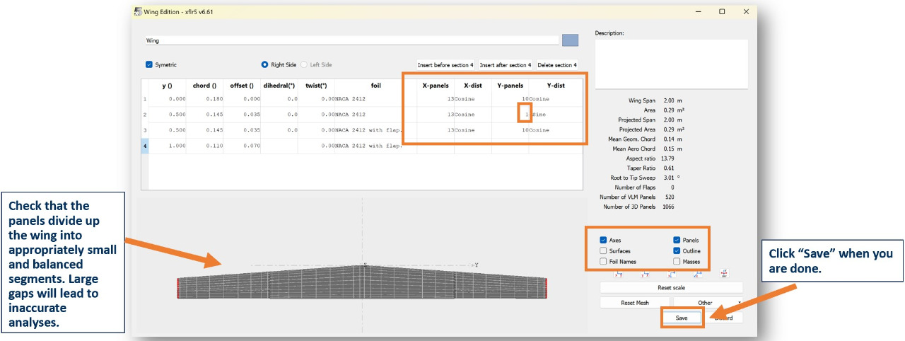 Next, check the paneling on the wing. On the lower right menu, toggle the "Surfaces" button off and the "Panels" button on. Set the Y-panels over long sections to fill the space and set the distribution to "Cosine" so the edges of the sections have more panels than the middle. Set overlapped sections to 1.